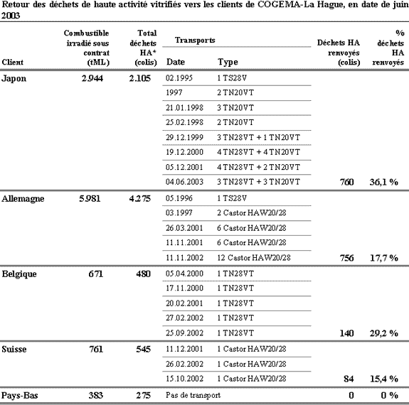 japonais, la COGEMA rattrape le retard de 2002 sur le retour des déchets.